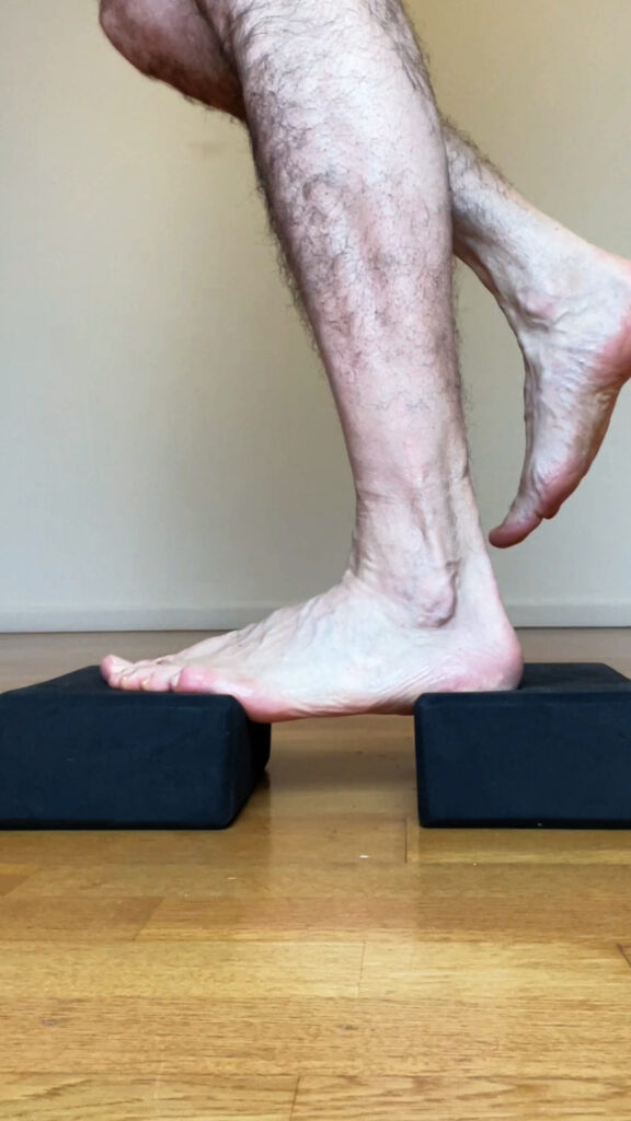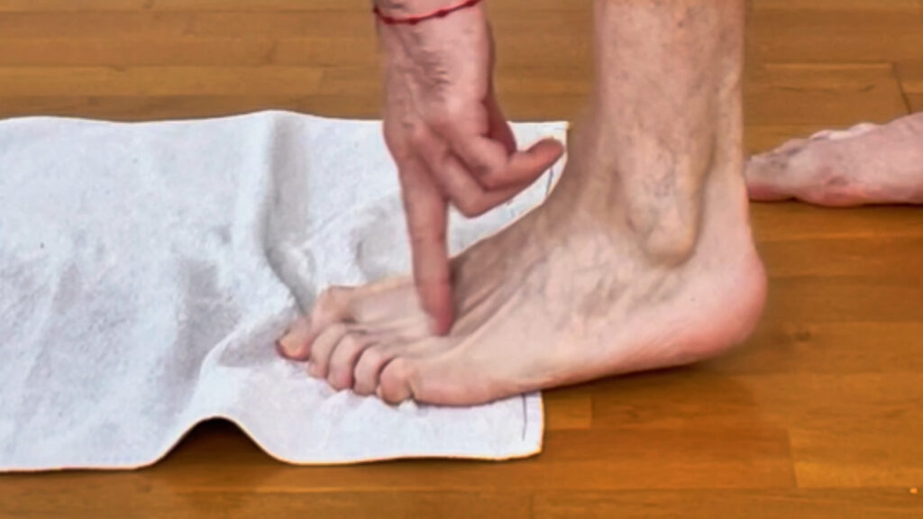Exemple de travail de l’arche plantaire : cet exercice simple ne doit pas augmenter les douleurs et peut être réalisé de manière préventive contre les métatarsalgies ou quand la phase inflammatoire est passée. Il consiste à tenter de monter la partie du pied dans le vide en tendant l’arche plantaire.