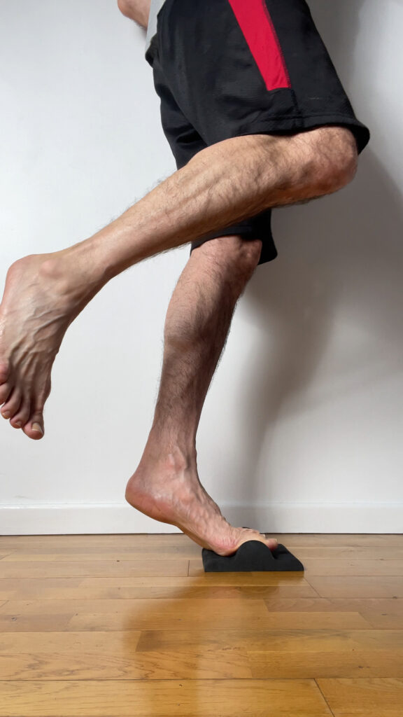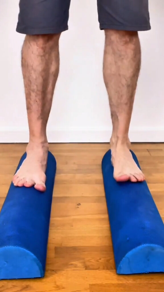 Marcher ou rester en équilibre sur des demi-rollers en mousse (bipodal ou monopodal) est très bénéfique pour réaligner un pied souffrant d’hallux valgus.