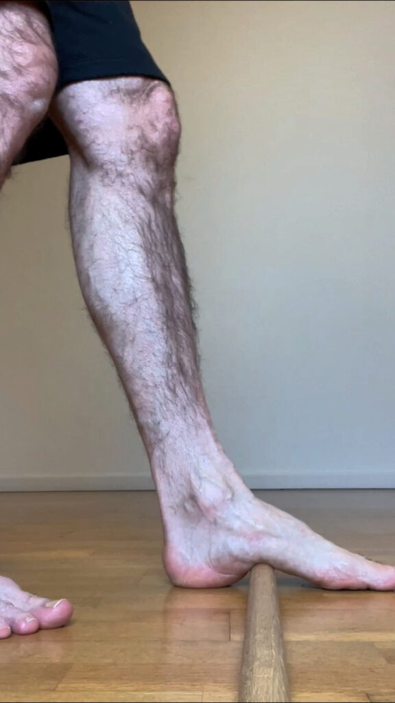 Massage du fascia plantaire avec bâton et balle de tennis.