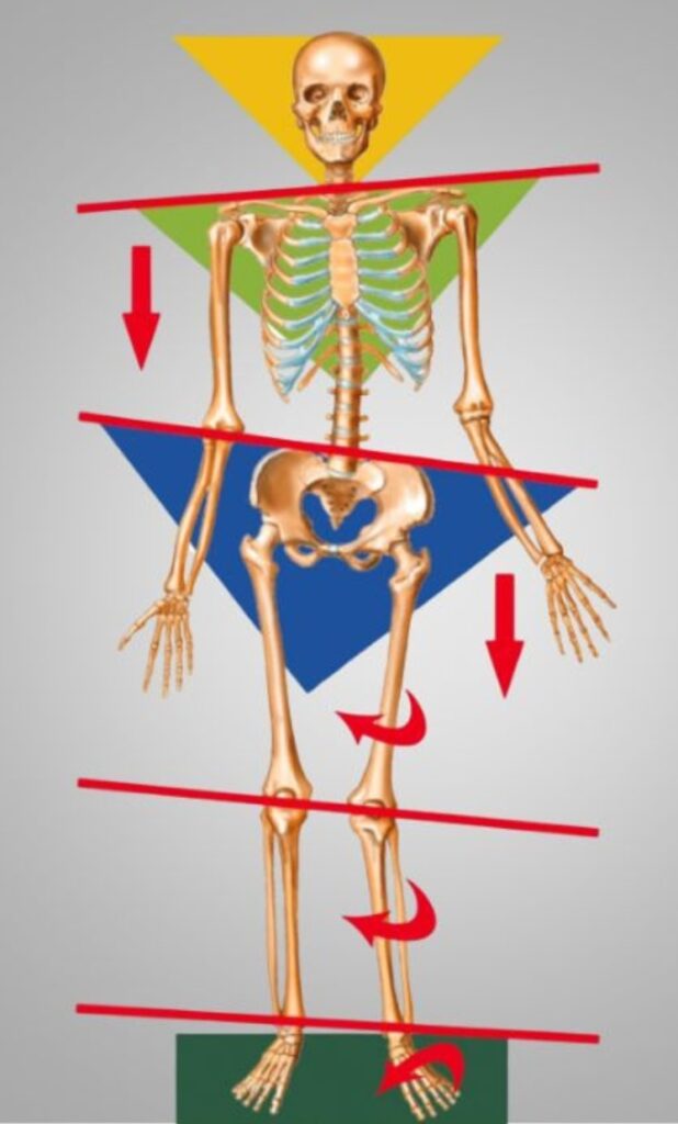 Un pied fixé en pronation peut créer un valgus du genou qui lui même peut causer une rotation interne de hanche et en amont une rotation et inclinaison du bassin. Tout est connecté dans le corps.