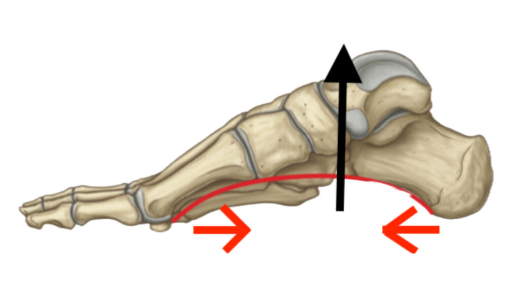 Arche haute en propulsion, mais peut s’abaisser s’abaisser en réception/pronation. Le médio-pied se déforme, puis se restructure. Le talon peut aller en léger valgus contrôlé, puis revenir.